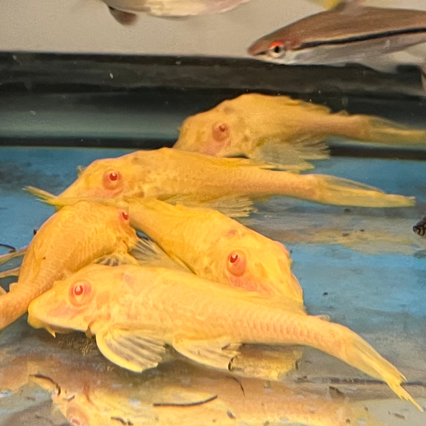 Unit price / perThe Albino Pleco (Ancistrus cf. cirrhosus) is a member of the Loricariidae family of South American suckermouth catfishes. While many suckermouth catfish species have yet to be bred on any major scale in aquariums, the Longfin Bristlenose Pleco is one of the most easily- and often-bred “pleco” species in the aquarium hobby and many popular color morphs, such as this variety, have been developed. This fish is immediately distinguishable by its highly variable pink and yellow marbled pattern as well as the growth of many bristle-like appendages on its facial area beginning in sub-adulthood. Both sexes grow the appendages, but the growth and length is much more pronounced in males.