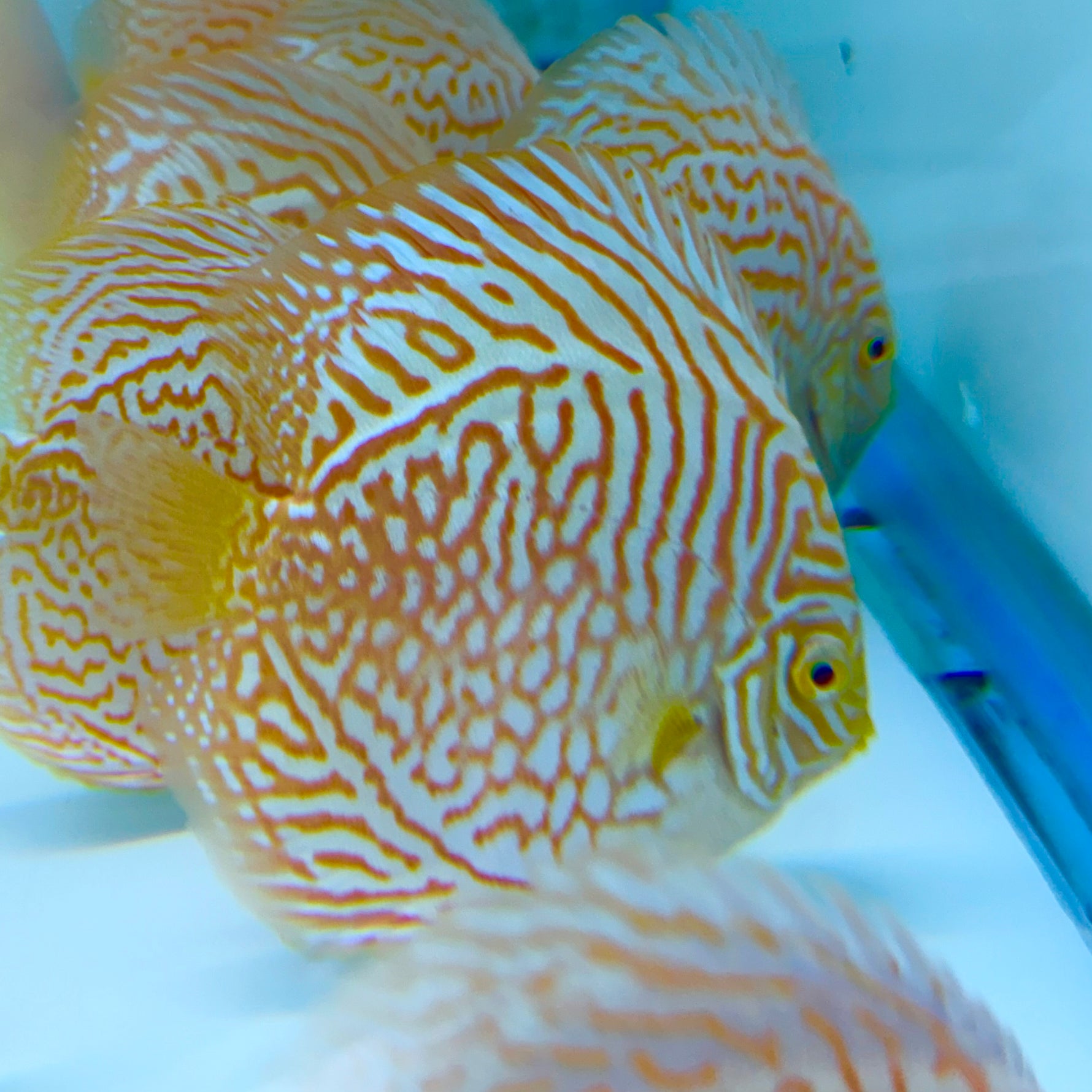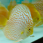 The ah pigeon snake skin discus has a body that sports a snakeskin design with solid irregularly shaped red lines imprinted on the body's white backgrounds. The overall coloration of Discus will vary depending on mood and overall health of the fish. Discus are among the most popular aquarium fish.
