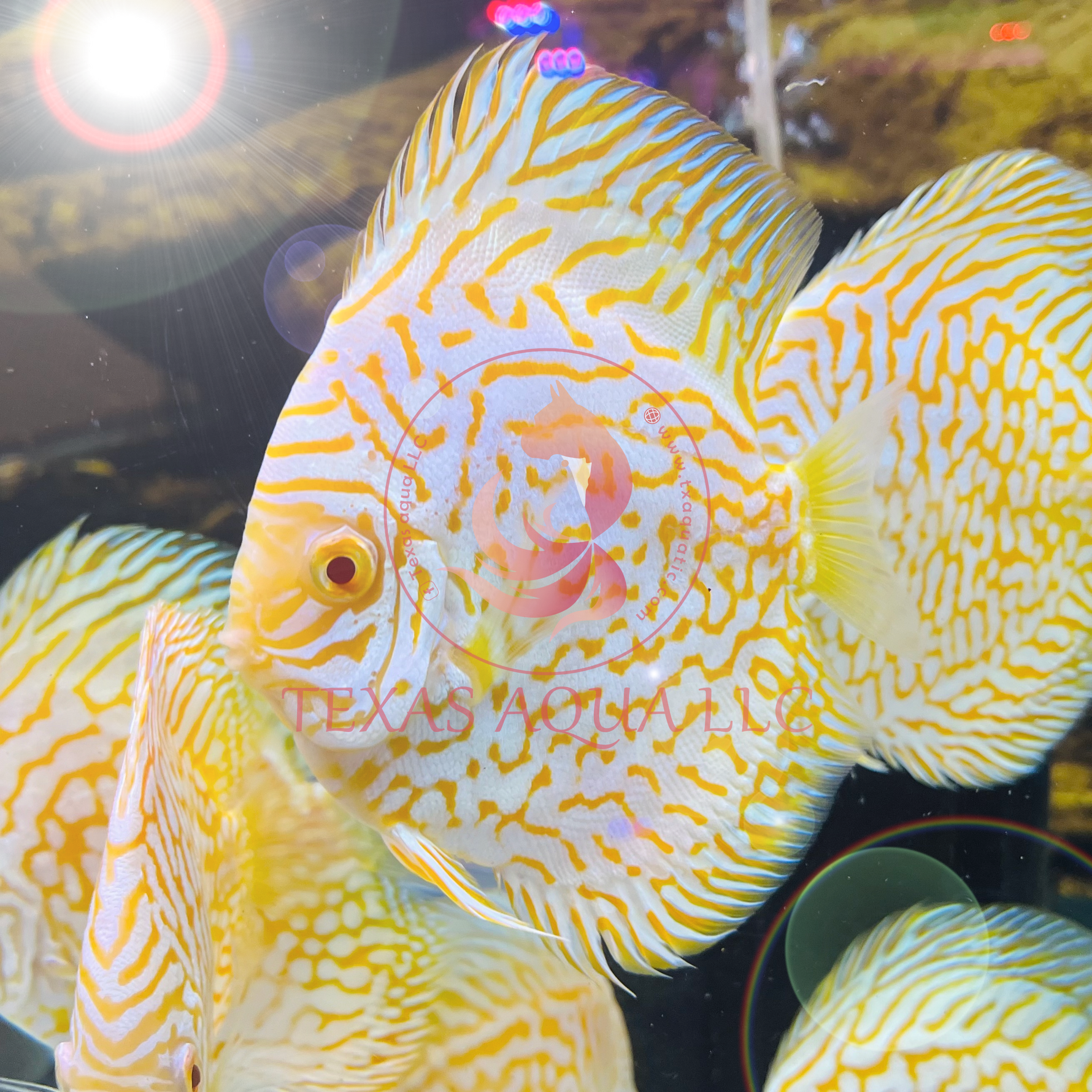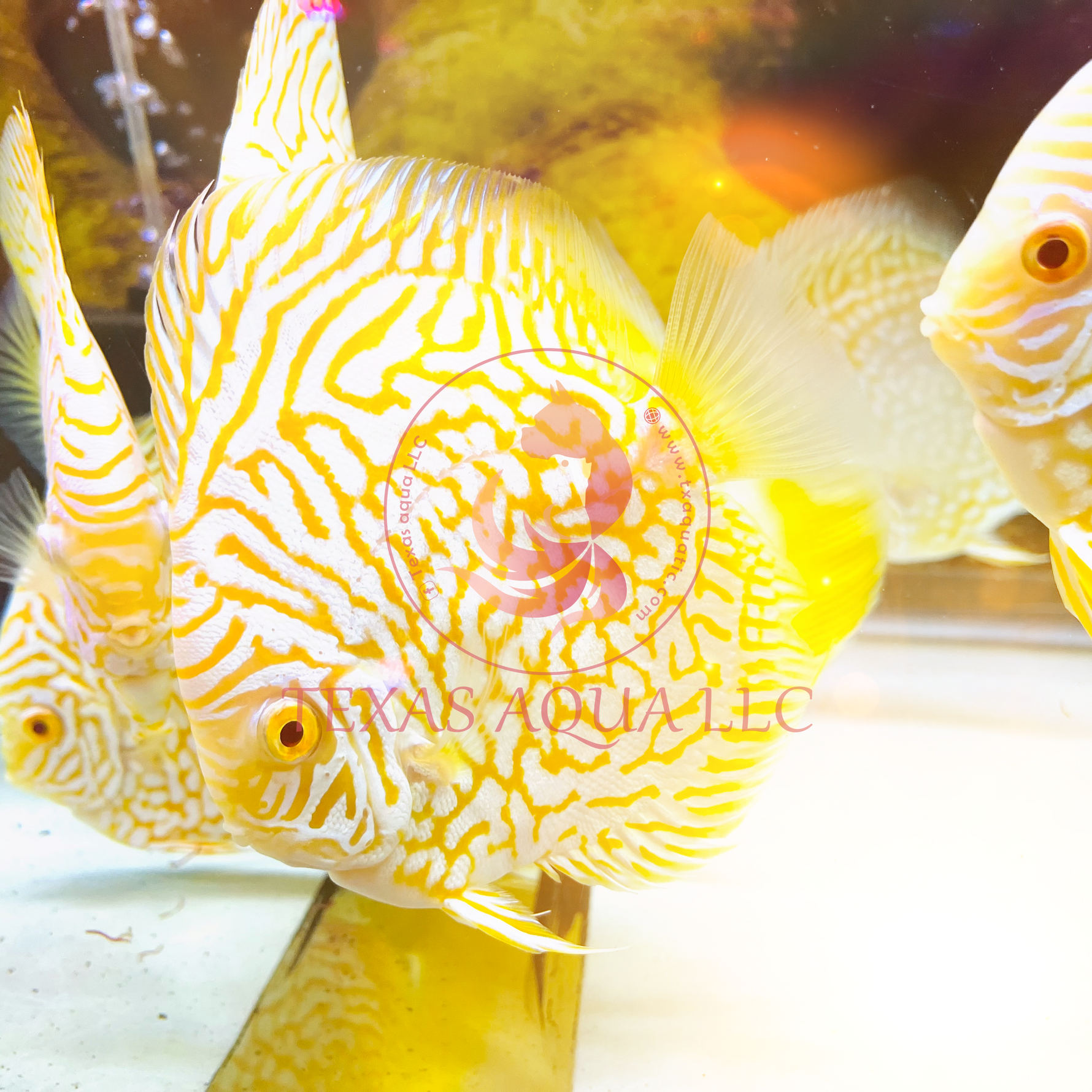 Precio unitario / porAlbino Golden Checkerboard is one of our special fish only available at Texas Aqua. You will not able to find this special strain anywhere else in the U.S market for this quality. If you are in love with checkerboard pigeon discus but worry about peppering on pigeon blood then you don't have to worry about it anymore. No matter how dark your tank is, this special strain will never ever get peppering. 100% guarantee