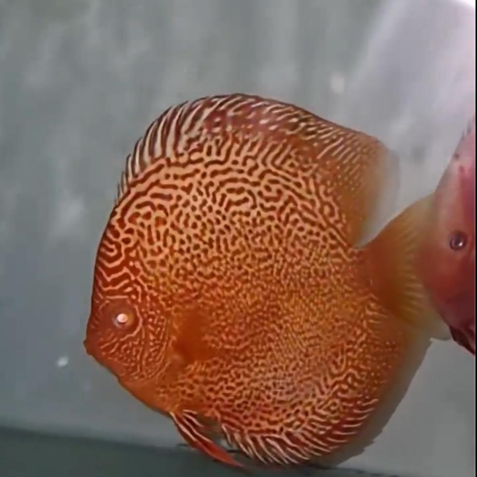 This is one of Texas Aqua Special Albino Strain. The AB Leopard Snake Skin Discus displays a captivating pattern that combines the beauty of leopard spots with the sleekness of a snake's skin. Its base coloration can range from light beige to pale yellow or cream, providing a stunning backdrop for the intricate markings. The body is adorned with irregularly shaped, dark spots that resemble leopard spots. In addition, these spots are connected by thin, sinuous lines, creating a snake-like pattern that runs along the body of the discus. The contrast between the spots and the snake-like lines gives the fish a truly unique and mesmerizing look. Similar to other discus fish, the Leopard Snake Skin Discus is relatively large. When fully mature, it can reach a diameter of around 6 to 8 inches (15 to 20 centimeters). However, growth rates and maximum sizes can vary depending on factors such as water quality, diet, and overall care.
