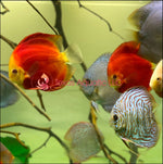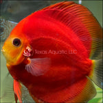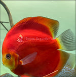 The Supper Red Ninja Discus is one of the many strains of discus that through genetic mutation have produced a reproducible color variation of the Discus fish. This strain has deep red color on their body with a small yellow or white face. Red Ninja Discus aquariums should closely resemble their natural Amazonian habitat with plenty of plants and branching root or driftwood. Water parameters should be very consistent with a pH near 6.5 to 7.2, temperature between 80° to 86° Fahrenheit with low to medium water currents. Discus can thrive in a wider range of water parameters as long as the changes are not sudden and the fish has adequate time to adjust to changing parameters. Red Ninja Discus should not be housed with aggressive or boisterous fish species or in aquariums with intense lighting or strong water currents.