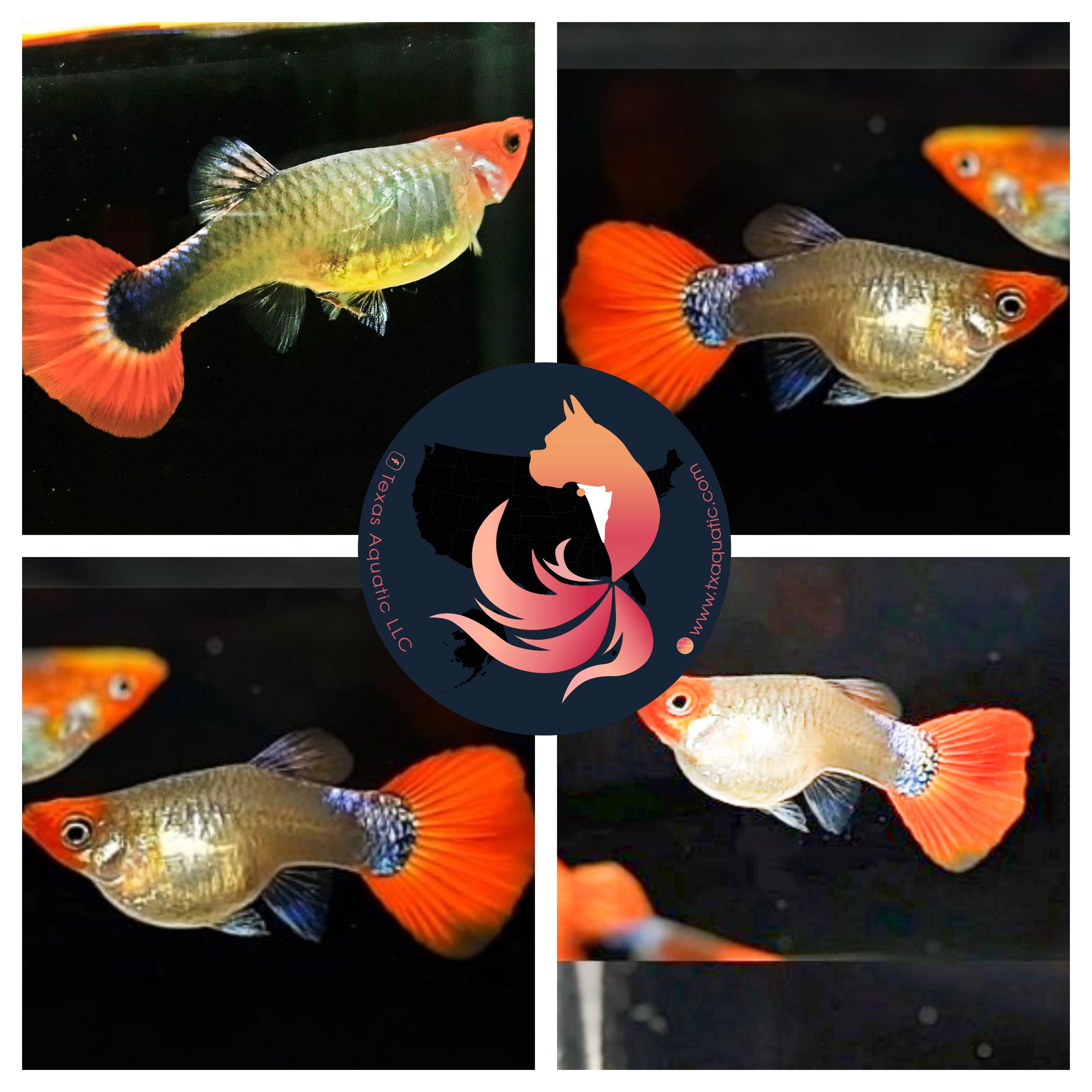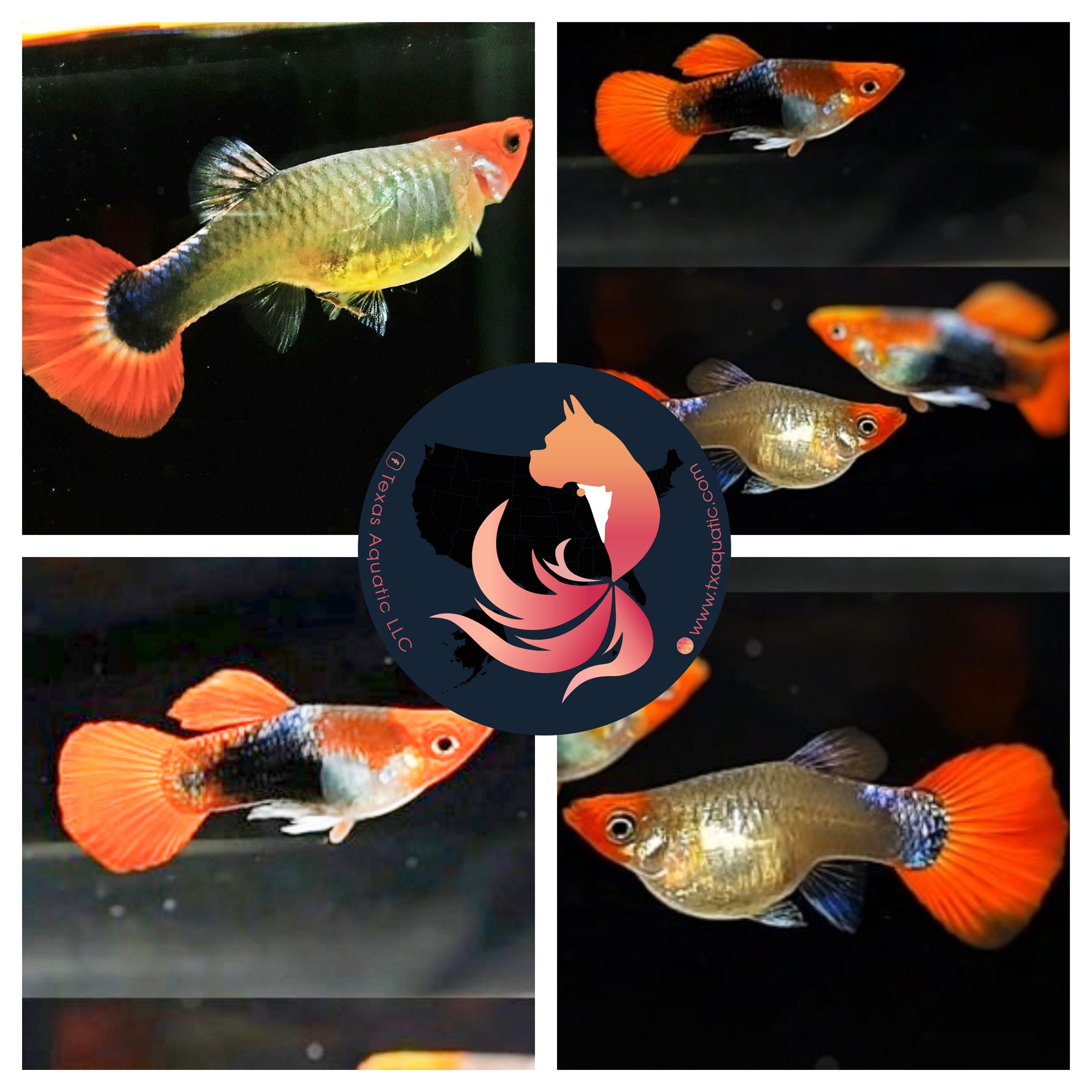 The Black Koi is one of many unique color variety of Poecilia reticulata guppy developed through years of careful, selective breeding. This brilliantly colored fish showcases a stunning jewel-like a koi fish with red coloration, making it a coveted addition for guppy aficionados or any freshwater aquarium enthusiast specially with big dorsal .