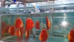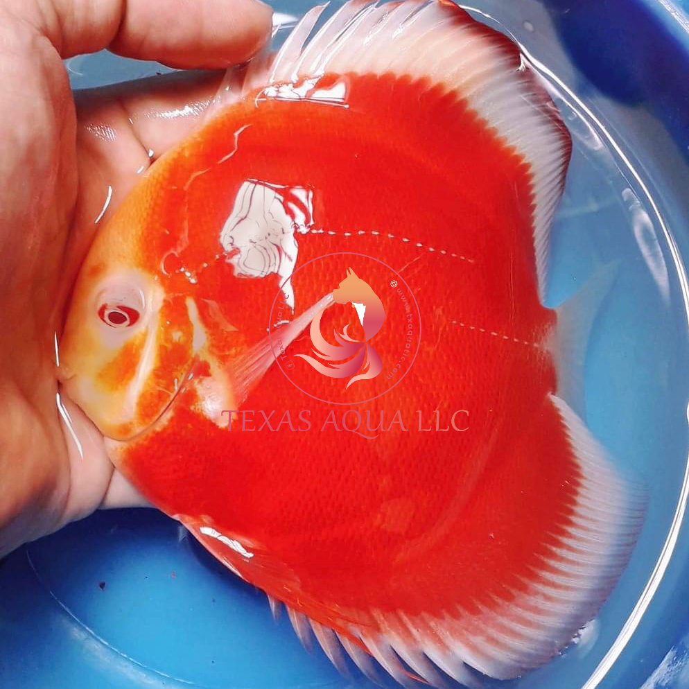 The albino Red cover Discus is one of the many strains of discus that through genetic mutation have produced a reproducible color variation of the Discus fish. This strain has bright red color on their body with a white face and some come with white rim. . AB Red cover Discus aquariums should closely resemble their natural Amazonian habitat with plenty of plants and branching root or driftwood. Water parameters should be very consistent with a pH near 6.5 to 7.2, temperature between 84° to 86° Fahrenheit with low to medium water currents. Discus can thrive in a wider range of water parameters as long as the changes are not sudden and the fish has adequate time to adjust to changing parameters. AB Red cover Discus should not be housed with aggressive or boisterous fish species or in aquariums with intense lighting or strong water currents.