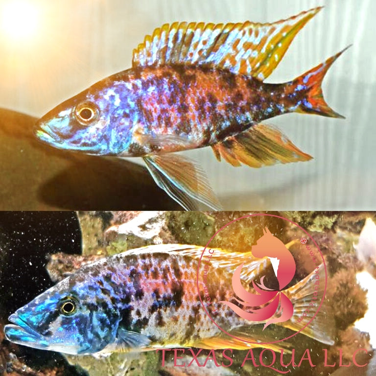 This is the OB form of the Dimidiochromis compressiceps. It is unfairly referred to as the Malawi Eye Biter. This piscivore is found though out the Lake in reeds and Vallisneria beds where it preys on juveniles (particularly Copadichromis spp.) hiding among plants. Its laterally compressed body helps it avoid detection. It has a large protractible mouth can reach out & suck in its victims. This large mouth also accommodates large spawns. This is one of my favorite cichlids on is commonly found is the Hap, Hap/peacock and standard mixes featured on this site. The compressiceps does well with the Red Zebra Stampede and Rainbow Zebra foods, supplemented with Krill. A tank size of 55 gallon and larger is recommended with a temp of 78 to 82 degrees and an aquarium or cichlid salt at the rate of 1 tablespoon per 5 gallons is also helpful