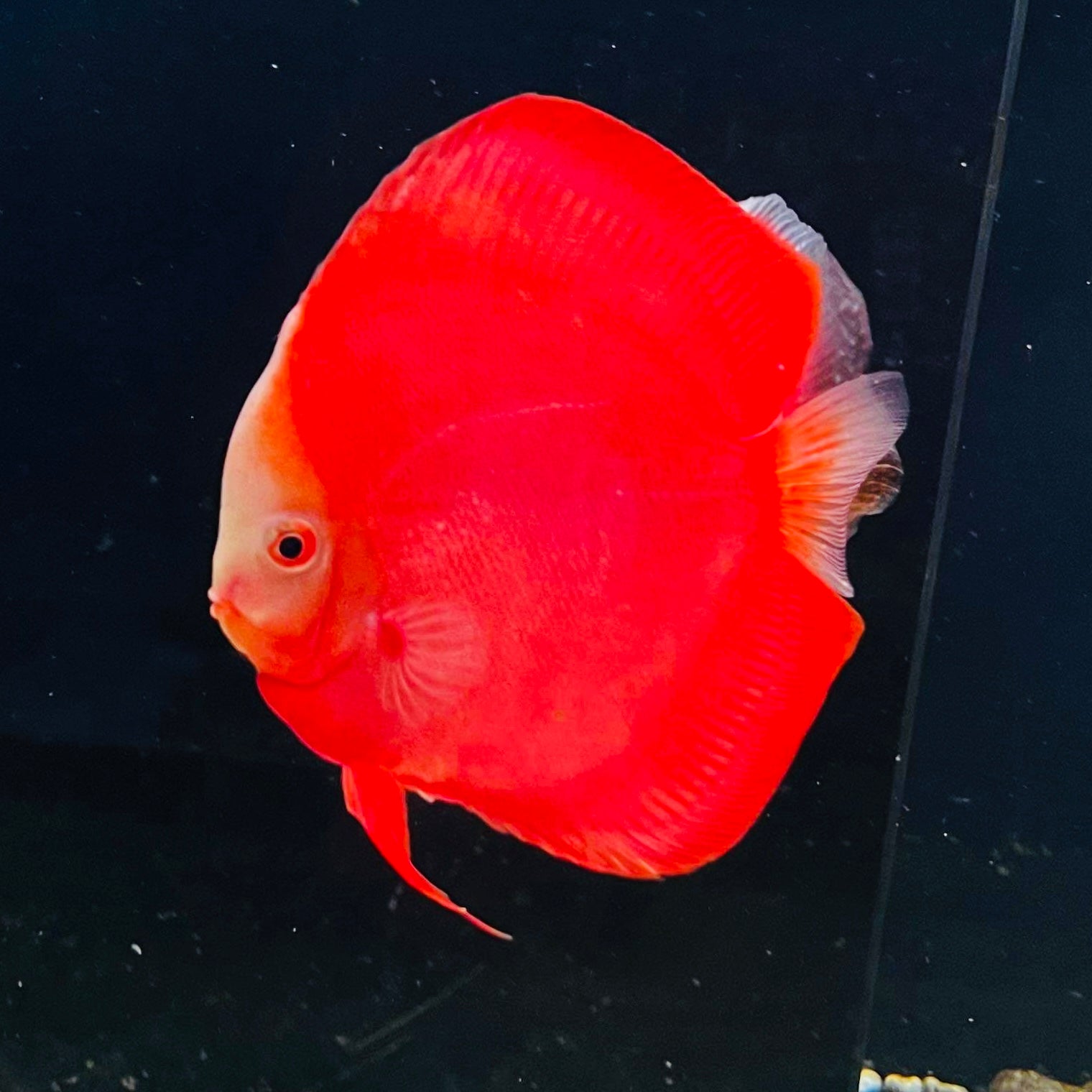The Supper Red Valentine Discus is one of the many strains of discus that through genetic mutation have produced a reproducible color variation of the Discus fish. Red Valentine Discus aquariums should closely resemble their natural Amazonian habitat with plenty of plants and branching root or driftwood. Water parameters should be very consistent with a pH near 6.5 to 7.2, temperature between 80° to 86° Fahrenheit with low to medium water currents. Discus can thrive in a wider range of water parameters as long as the changes are not sudden and the fish has adequate time to adjust to changing parameters. Red Valentine Discus should not be housed with aggressive or boisterous fish species or in aquariums with intense lighting or strong water currents.